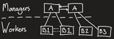The Managers layer uses the Docker Manager Hosts to manage the set of worker services. The Managers in this case handle Load balancing, the connection to the internet and the distribution of tasks among the nodes of their swarm. In the case of this particular setup, the application on these managers also monitors the health (network stability, capacity consumption, connectionStatus, errors) of the workers. The manager is at liberty to deploy new workers (nodes) should capacity demand it, or kill nodes that are no longer required or malfunctioning. All workers consist of identical applications fed by metadata (such as credentials, identifier, etc.) from the Manager that deploys their instance.